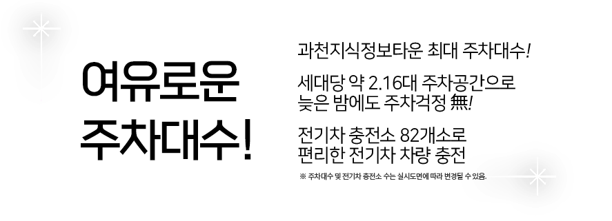세대당 약 2.16대의 압도적 주차대수 전기차 충전소 총 82대 계획 스크린골프연습장, 피트니스 센터, 북카페 등 다채로운 커뮤니티